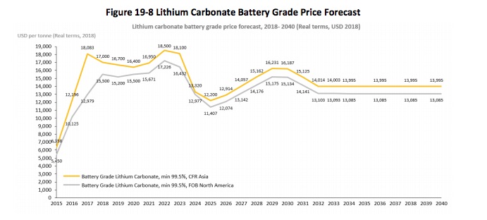 According to Benchmark Mineral Intelligence, the lithium market will grow in three phases. The first phase, where we are currently, is showing the last year of tightness. However lithium carbonate prices are expected to remain high between 2019 and 2022. At that point, the market may experience some oversupply as new projects come online, but the consultancy expects prices to settle at $13,000 a tonne. Longer term, the forecast is for $15,500 to 17,200/t through 2023.