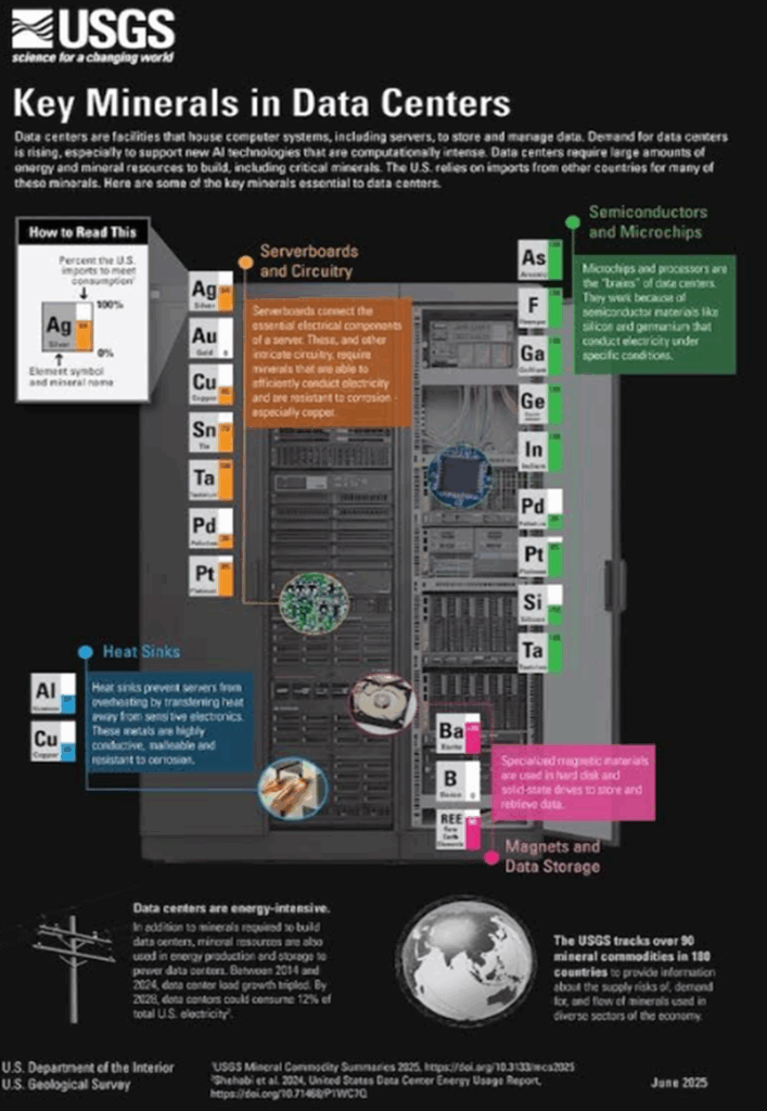 The excellent graphic below by the US Geological Survey summarizes the key minerals used in a data center. The percent inside each mineral “box” refers to the percent the US imports to meet consumption for that mineral.