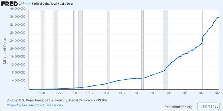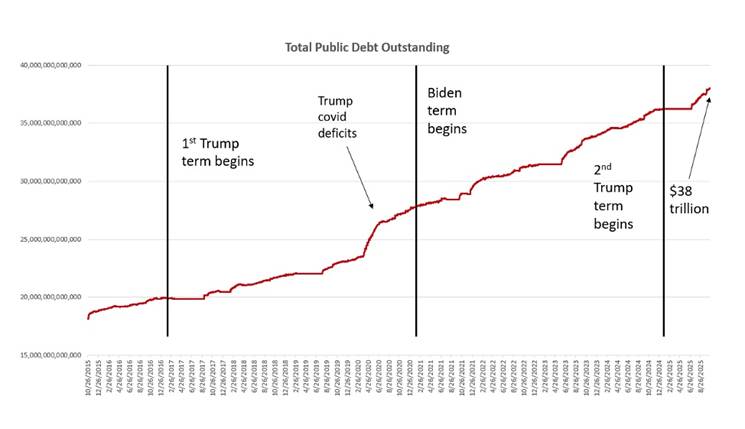 It took 188 days for the debt to grow from $35 trillion to $36 trillion. It took another 265 days to reach $37 trillion. But don’t be fooled. The borrowing didn’t slow down between $36 and $37 trillion. It was just that the federal government ran up against the debt ceiling on January 1. As a result, it couldn’t borrow any money until the enactment of the “Big Beautiful Bill,” which raised the debt ceiling by $5 trillion as of July 1.