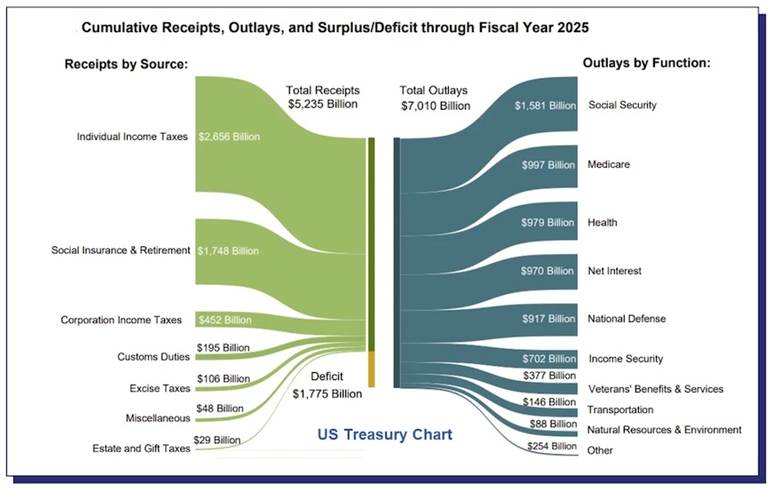 For the fiscal year ended on Sept. 30, the federal government spent a little more than $7 trillion and ran a $1.8T deficit. The $7T was a $310 billion increase from full-year 2024. The recipients were the usual suspects: Social Security, Medicare and Medicaid (representing a combined $245 billion). Spending on the Pentagon was $38 billion, and the Department of Veterans Affairs received $41 billion.