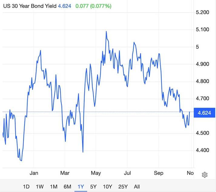 Soaring long-term bond yields graphed above are raising questions about how long the US government can service its debt, and whether it could precipitate the next financial crisis.