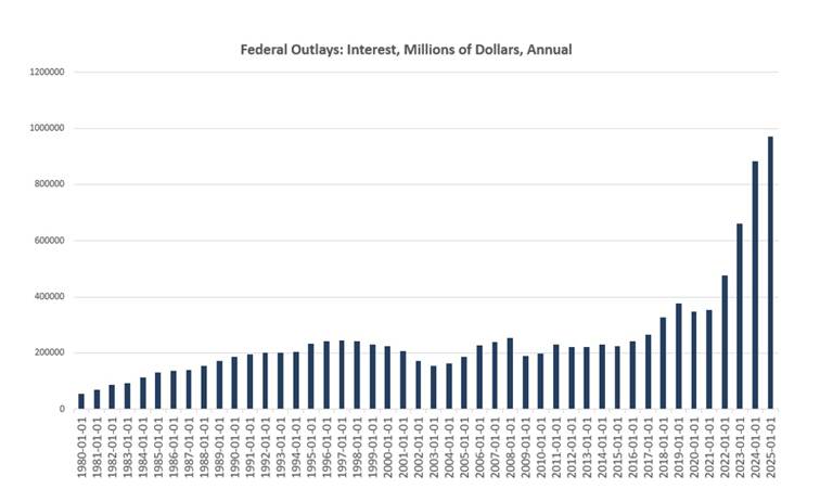 Well, so what? The figure is more impactful if one appreciates that in the last fiscal year, the US government spent more on debt interest than it did on national defense ($917 billion) or Medicare ($997B). Only Social Security was higher at $1.58 trillion.