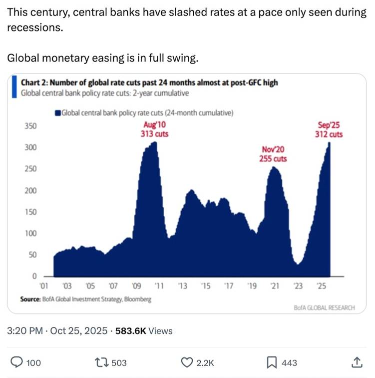 By comparison, the global pivot before and during the 2020 pandemic brought 255 cuts. This also marks a massive jump from just 30 rate cuts during the 2022–2023 period. So far, 82% of world central banks have cut rates over the last 6 months, the highest share since 2020. This century, central banks have slashed rates at a pace only seen during recessions. Global monetary easing is in full swing.