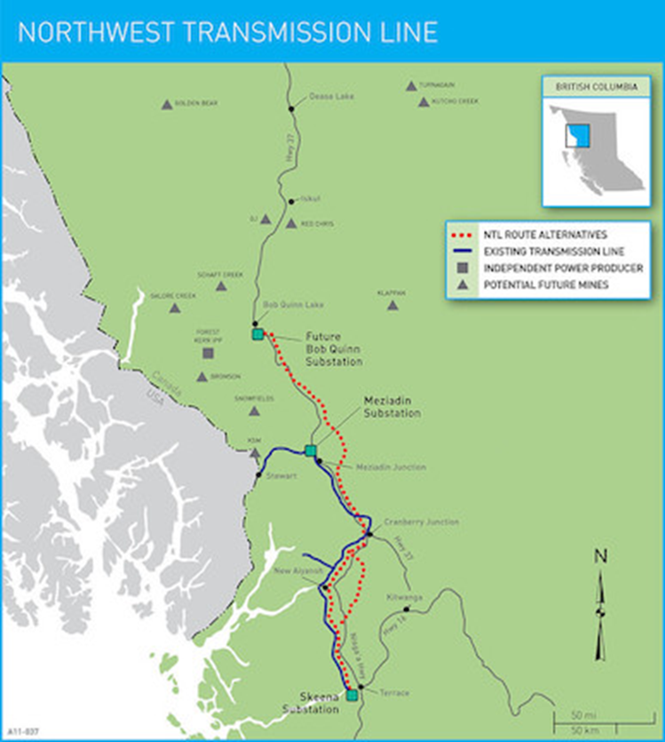 We remind our readers that there is already a high-voltage transmission line in place in northern BC. The Northwest Transmission Line entered service in July 2014. The $746 million line was designed to bring power to mining properties previously inaccessible to the grid and reliant on diesel-powered portable generators.
