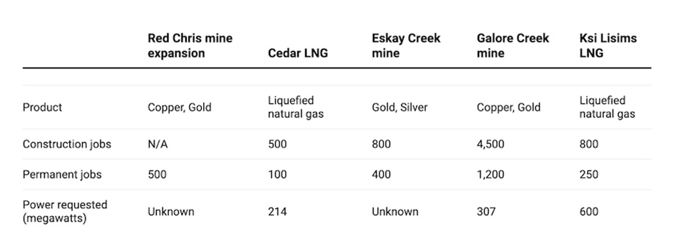 To what other major projects would the North Coast Transmission Line provide connectivity? The provincial government has been tight-lipped on the matter, but The Narwhal managed to find out through an Oct. 28 press release from the NDP caucus that there are five projects.