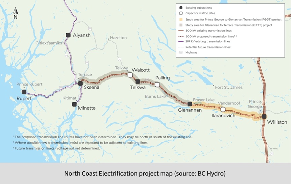 The North Coast is currently supplied by 450 km of 500-kV transmission lines from Williston substation near Prince George to Skeena substation near Terrace. Glenannan and Telkwa substations are located along the 500-kV lines.