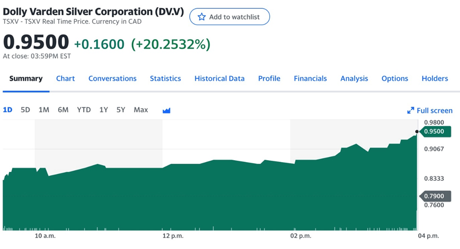 Dolly Varden Silver’s (TSXV:DV, OTCQX:DOLLF) stock price shot up 16 cents for a gain of 20% Thursday, after announcing a consolidation of its Big Bulk property, which lies within its Kitsault Valley project.