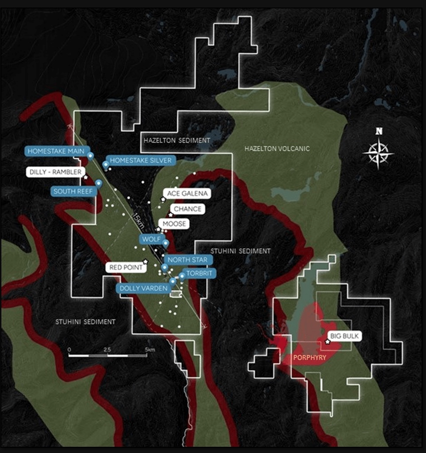 Other historically active mines in the area include North Star and Wolf, which remain underexplored to this day. Together, the four deposits comprise about 90 square kilometers within the Stewart Complex.