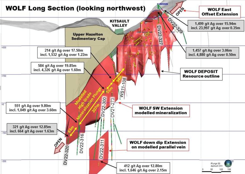 Drill holes DV22-315 and 317 are on the section with DV22-316 (Figure 2) but intersected the Wolf structure approximately 100 meters above and 75 meters below, respectively, the projection of the higher-grade silver zone intersected in DV22-316.
