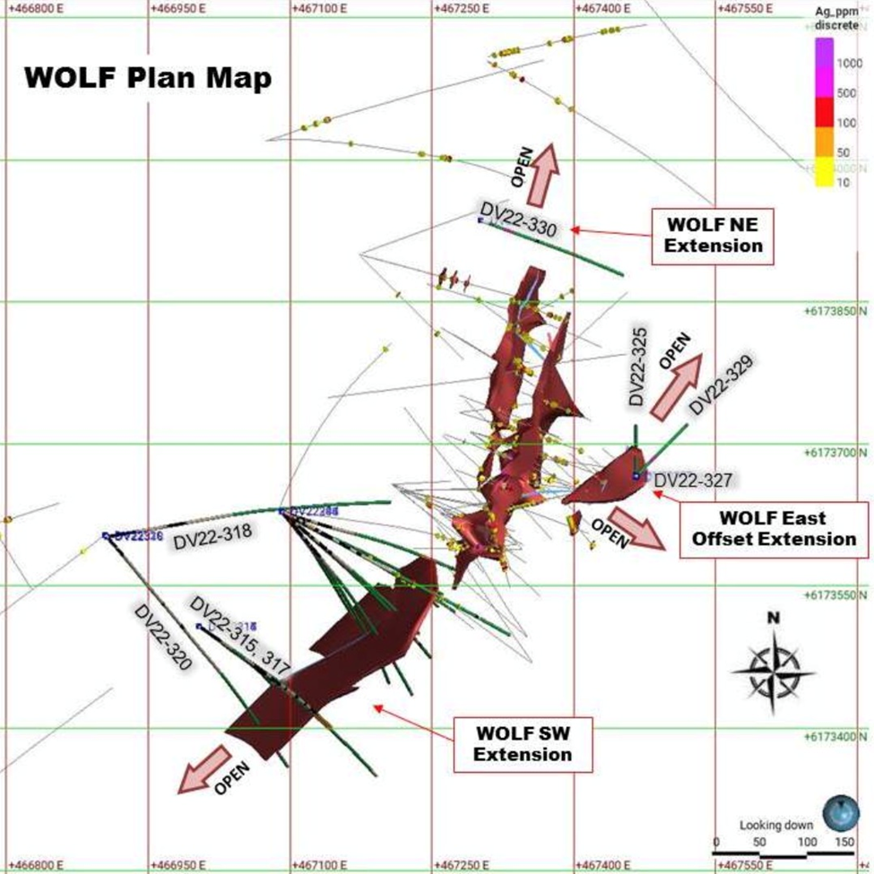 • Wolf Vein Southwest: DV22-320: 321g/t Ag, 0.84 %Pb, 0.84% Zn over 12.85 meters (6.81 meters estimated true width) including 664 g/t Ag, 1.24% Pb, 3.54% Zn over 1.63 meters (0.86 meters estimated true width).