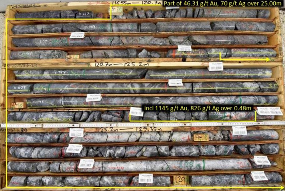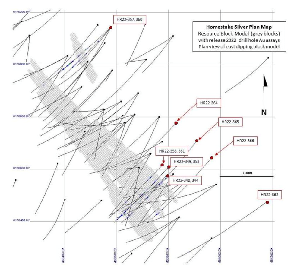 Step out drill hole HR22-362, located approximately 200m down dip and along the targeted projection of a Homestake Silver resource domain intersected vein breccia over a 2.50m core length, grading 1,252 g/t Ag, including 0.75m g@ 3,330 g/t Ag. Relatively little drilling has been completed at Homestake Silver and with these step out mineralized intersections the expansion potential to depth and along strike has been demonstrated.