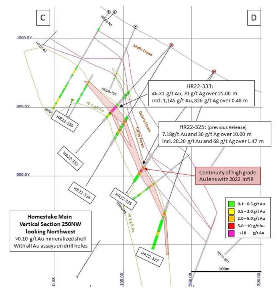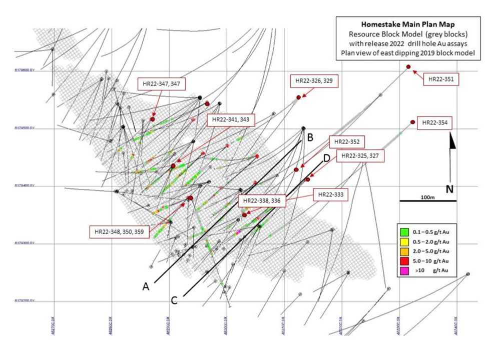 Four of the drill holes at Homestake Main were drilled below the mineral resource domains to test for down dip extensions. Holes HR22-326, 329, 351 and 354 all intersected the structures that host gold mineralization below the resource.