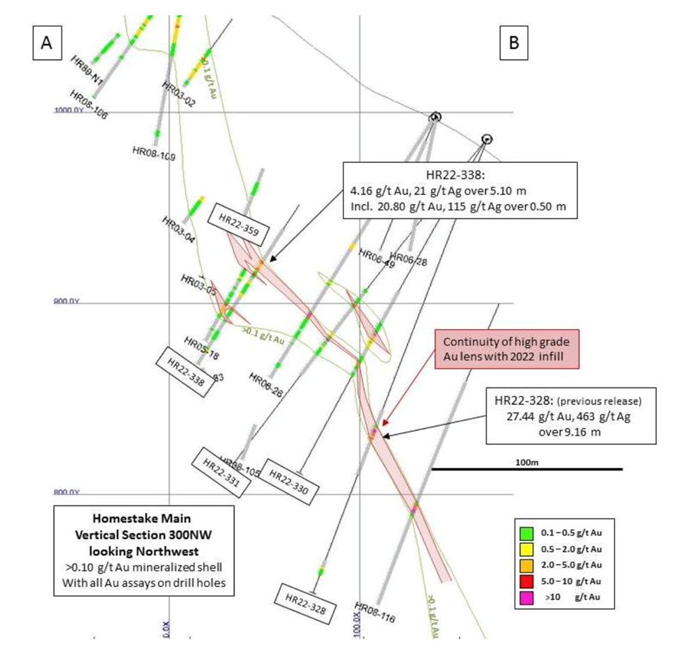 The objective of 2022 drilling was to expanded multiple sub-parallel mineralized zones and to upgrade inferred resources at these deposits. Forty-one holes and 10,472 meters were completed at Homestake Main, 12 holes (6,076 meters) were drilled at Homestake Silver, and three holes were sunk along the Homestake Ridge trend.