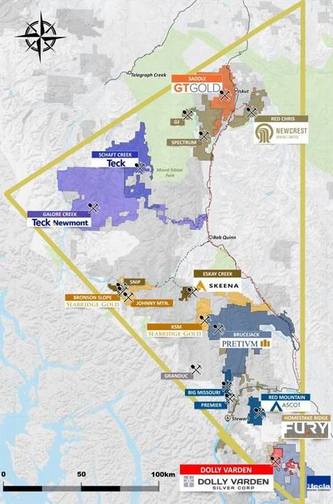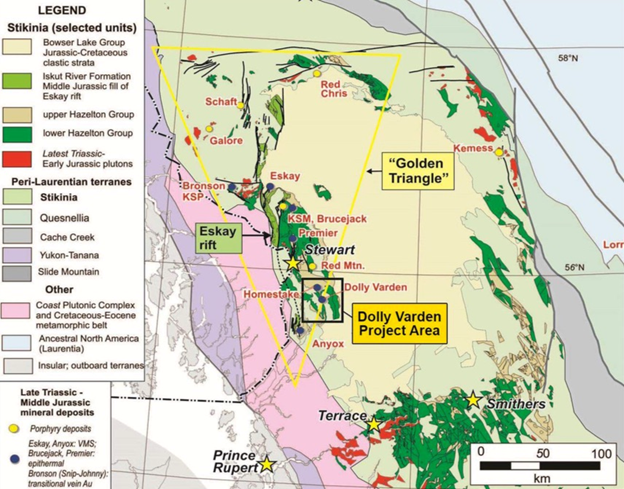 It lies to the west of Hecla Mining’s (NYSE:HL) Kinskuch Project, and borders Fury Gold Mines LTD (T:FURY) Homestake Ridge, where a PEA envisions a 13-year mine with peak annual production of just over 88,000 gold-equivalent ounces. More than 275 holes totaling over 90,000 meters have been completed on the property. Hecla’s Kinskuch is an early-stage project with the potential for discovery of epithermal silver-gold, gold-rich porphyry and VMS deposits. On the map below, note that Dolly Varden’s project is located in the bottom corner of the Golden Triangle, which hosts deposits and mines such as Teck’s Schaft Creek, Teck/Newmont’s Galore Creek, the Red Chris Mine formerly owned by Imperial Metals, now operated by Australia’s Newcrest, and Seabridge Gold’s monster KSM deposit.