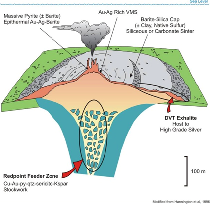 Note that Eskay Creek isn’t a pure gold-silver deposit, but is rather described as a volcanogenic massive sulfides (VMS) deposit with substantial base metal credits. High-sulfidation VMS deposits form near underwater vents, or “black smokers”, where base and precious metals-rich hydrothermal fluids exhale onto the seafloor in shallow water, and eventually form mineral deposits.