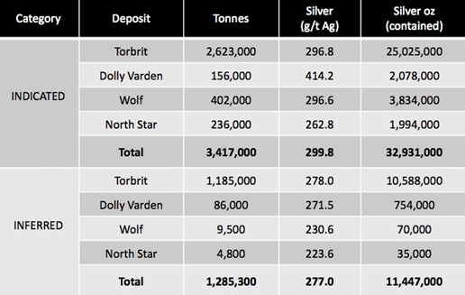 2012 drilling targeted the Dolly Varden mine, with assay highlights of 5.3m grading 536 g/t Ag. Work in 2013 focused on the Torbrit Mine, with underground rehabilitation, surveying and sampling, in addition to 3,064 meters of drilling in 14 holes. Nearly all holes at Torbrit intersected significant VMS mineralization ranging in thickness from 9.3 meters to 89.1m. One assay highlight was 17.1m grading 509 g/t Ag.