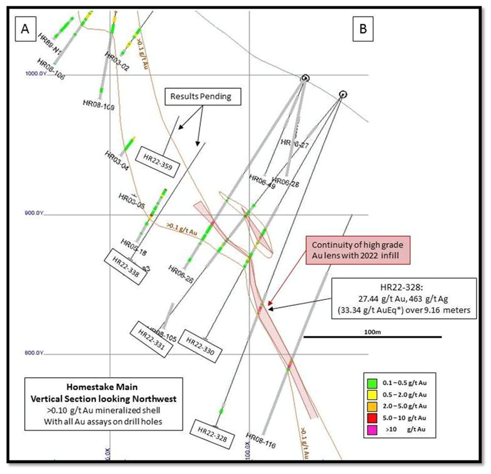 The results were primarily infill drilling from current inferred resource areas and suggest that the higher-grade gold-silver lenses may be continuous over more extensive areas than previously interpreted. In addition, the drilling has generated new targets down-dip ofthe Homestake Main deposit, along the projected plunge of the higher-grade shoots that are wide open for expansion. More assays from the Homestake Main and Silver deposits are pending.