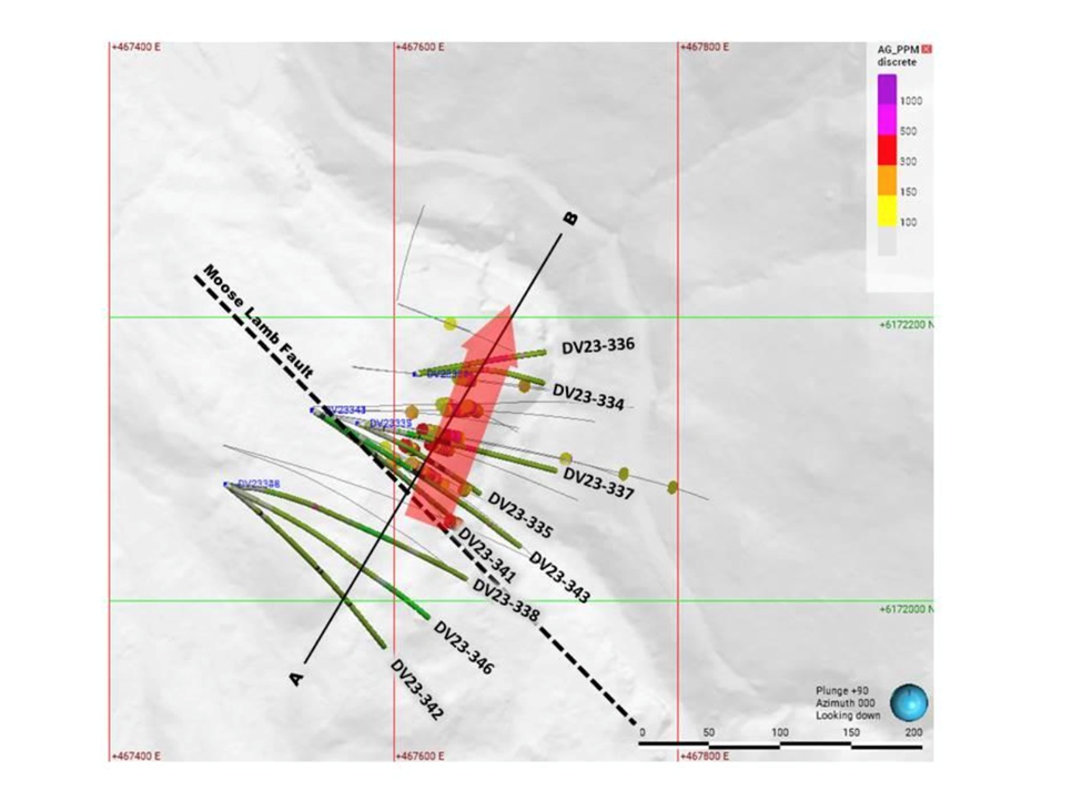 According to the company, holes DV23-334 and 336 extended the plunge extent of the wide, high-grade silver mineralization at the Kitsol vein for an additional 40 meters towards surface. The plunge direction has been extended to over 250m from the furthest southwest intercept, down plunge in drill hole DV22-323 (Figure 2).