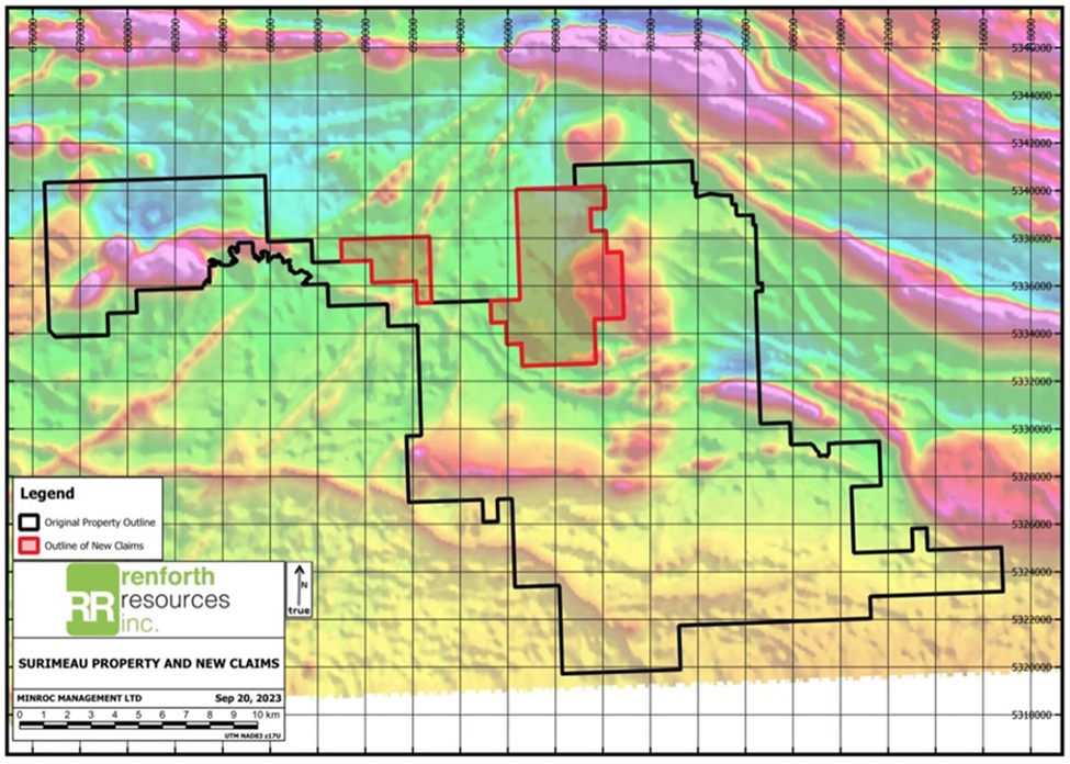 Renforth interprets the Victoria mineralized horizon, which stretches ~20 km west to east across the central portion of the ~330 square km Surimeau property, to be an “Outokumpu-style” mineralized occurrence, commencing on surface to the deepest pierce point drilled to date, ~160m vertical depth.