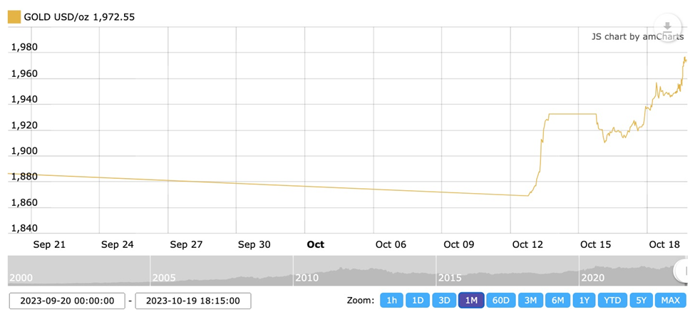 Gold’s move higher amidst the latest turmoil in the Middle East continues to have legs. The precious metal has gained over $162 in the last two weeks, reaching nearly $1,978 on Thursday afternoon.