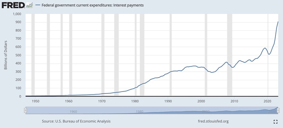 During 2021, before interest rates began rising, the federal government paid $392 billion in interest on $21.7 trillion of average debt outstanding, @ an average interest rate of 1.8%. We calculated if the Fed raised the federal funds rate to 4.6%, interest costs would hit $1.028 trillion — more than 2021’s entire military budget of $801 billion!