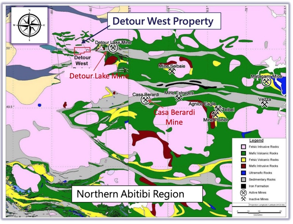 The company’s flagship Detour West property is located approximately 300 km north of Timmins, Ontario and covers 40,255 hectares of the Abitibi Greenstone Belt, one of the most prospective regions for gold on the planet.