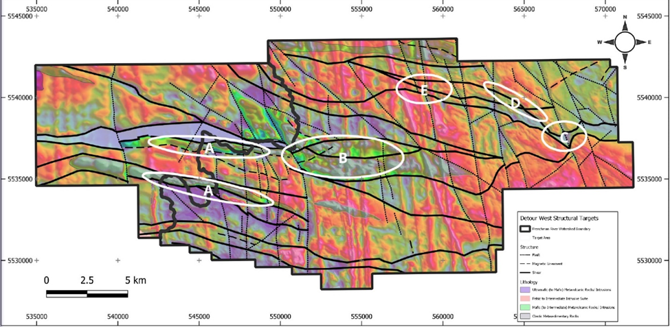 As mentioned, an airborne magnetic survey has been flown on the property, located 20 km west of the Detour Lake pit. That survey, plus historical data, a Lidar interpretation, and limited outcrop prospecting, indicate there are possible gold bearing structures running onto Detour West.
