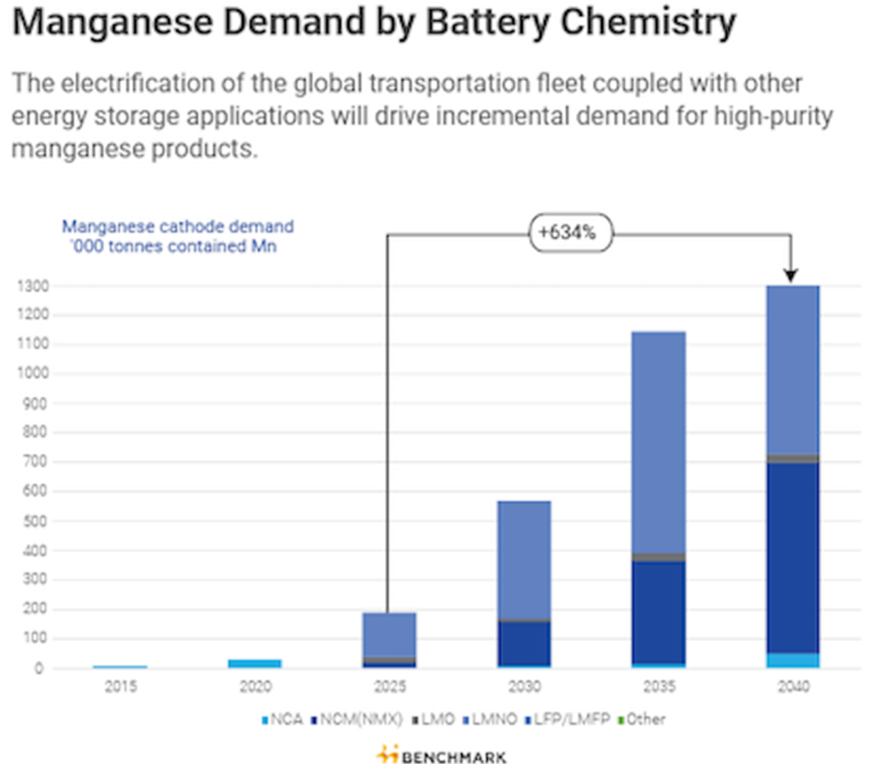 Major EV and cathode material producers are increasing manganese in lithium-ion battery chemistries. As a result, manganese cathode demand is expected to grow by over 600% by 2040.