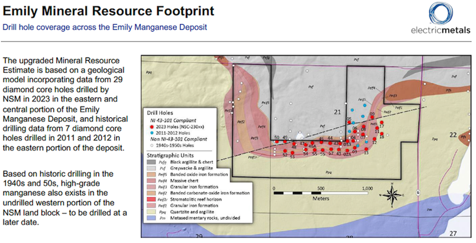The upgraded Mineral Resource Estimate is based on a geological model incorporating data from 29 diamond core holes drilled by North Star Manganese in 2023 in the eastern and central portion of the Emily manganese deposit, and historical drilling data from seven holes drilled in 2011 and 2012 in the eastern portion of the deposit.
