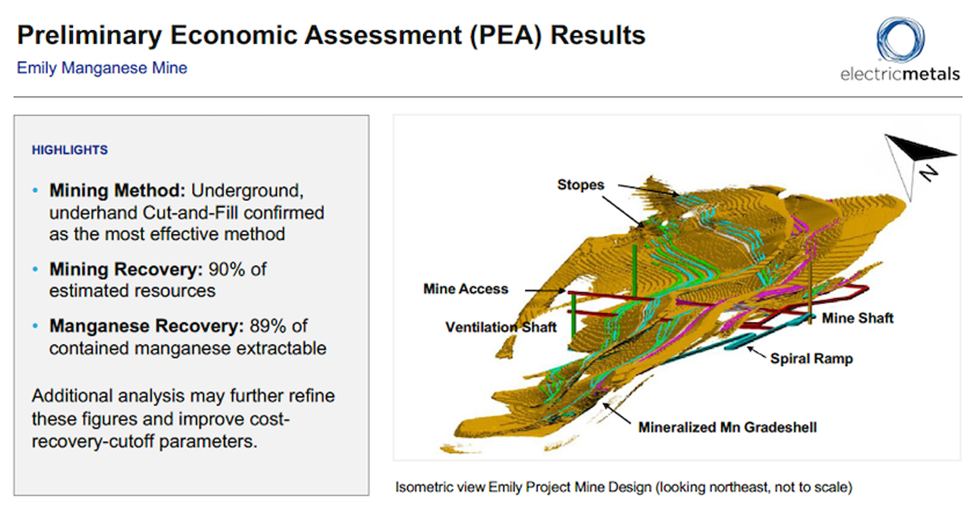 According to the PEA, underground, underhand cut and fill is the most effective mining method, with 90% mining recovery of estimated resources. Of this, 89% of contained manganese is extractable.