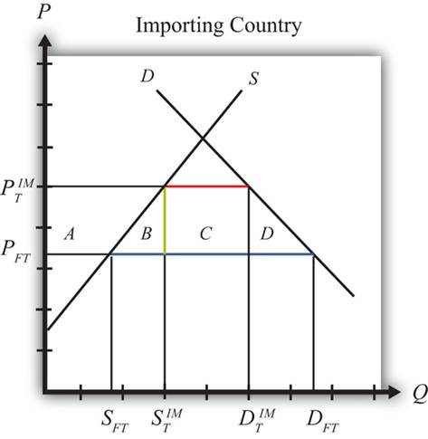 In this case, the reason the importing country faces a horizontal supply curve at PFT is because consumers in the importing country have to compete with the rest of the world’s consumers, and if they aren’t willing to pay at least PFT, exporters can find plenty of other consumers who are willing to pay that price. As such, if the importing country’s government imposes tariffs on this good, the full burden of the tax will be on domestic consumers because the only way exporters are willing to sell in that country is if they receive at least PFT.