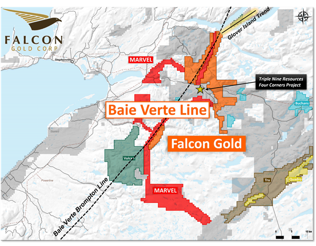 Falcon’s new claims are also 13 km southwest of the Glover Island Trend, an 11 km mineralized corridor that hosts 17 base metal and polymetallic mineral prospects as well as numerous gold showings and anomalies.