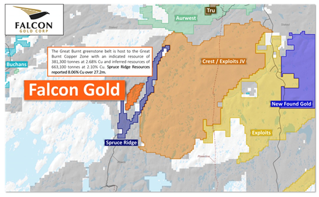 As shown on the map below, Falcon’s Great Burnt property is located right in the middle of Spruce Ridge’s land package. It is also situated 4 km west of the Crest Resources-Exploits Discovery joint venture project within the Exploits Subzone.