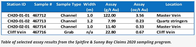 Falcon Gold’s first phase of exploration last year successfully identified gold mineralization over a 300m strike length. Highlights from a September 2020 sampling program included a 2.2m channel sample that averaged 59.8 g/t Au; a 1m channel sample from within the 2.2m sample assayed 122 g/t Au on the Master Vein. Additional highlights are in the table below.