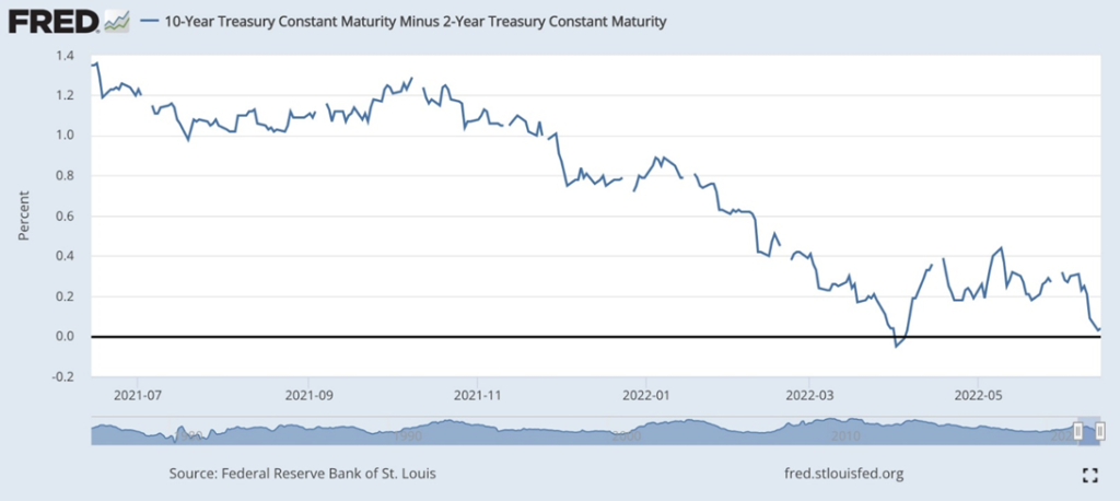 Two-year yields rose to around 3.25% on Monday, June 13, higher than the 10-year interest rate, causing the first yield curve inversion since April, as the FRED chart below shows the line dipping below 0.