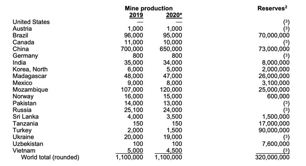 The mineral is sourced from only a few places. China currently is the world’s biggest producer, with 650,000 tonnes of mined graphite in 2020, representing nearly 70% of global supply.