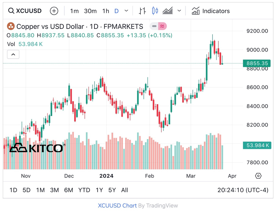 For the first two weeks of March, copper rallied 4.1%, hitting its highest level since April 2023.