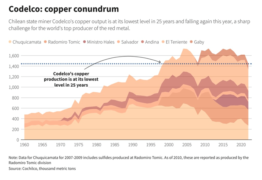 Chile’s copper output has been dented by a long-running drought in the country’s arid north. Codelco’s 2023 production was the lowest in 25 years.
