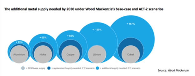 The commodities consultancy says meeting new emissions targets being set by countries like Canada, the US, Britain, China and Japan, will mean large-scale deployment of electric vehicles, renewable power and electrical transmission, all of which will require copious metal content.