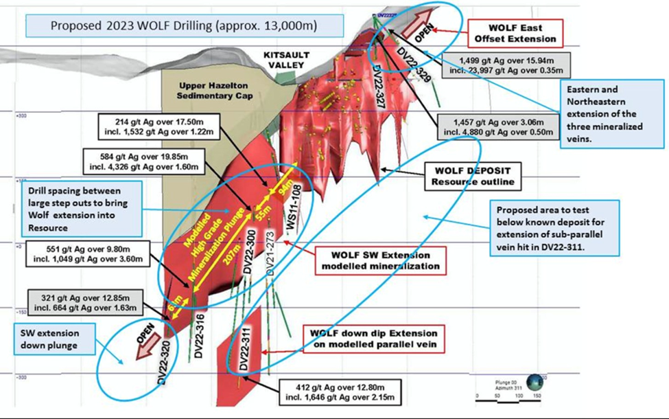 Drilling allocated to the Wolf deposit expansion (approx. 13,000 meters) will focus on both infill drilling of the wide-spaced intercepts from 2022, as well as further step-out holes in several directions where high-grade silver mineralization remains open. Similar step-out drilling will follow up on high-grade silver mineralization at the Kitsol Vein.