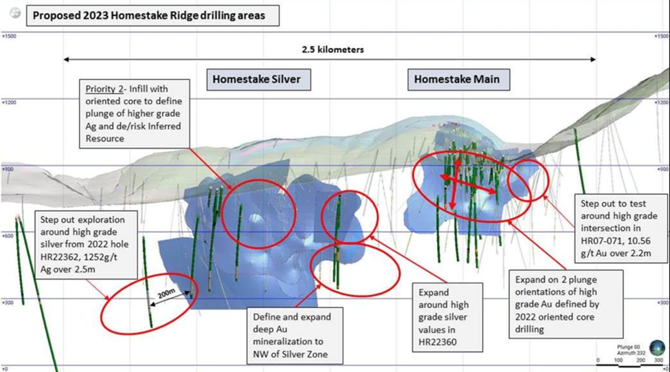 In several weeks, the drills will be moved up the valley to the Homestake Ridge deposits. Here, 2023 drilling is influenced by structural information gained from infill drilling at the Main deposit, where two main plunge directions have been identified. The planned drilling will target the down plunge extensions of higher-grade and wider zones of gold mineralization. Drilling at the Silver deposit will prioritize step-out holes where 2022 expansion drilling had success at the southern extent.