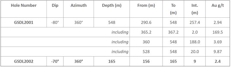 Hole GSDL 2002 a -70deg hole was started 150 meters east of GSDL 2001 towards the Cleary mine. It entered the target zone on que at 165m. The first 9m of the zone ran 2.4 grams gold. Then Covid-19 precautionary measures were enforced shutting the drill down but it’s ready to continue through the zone in Hole 2002 as soon as permitted.