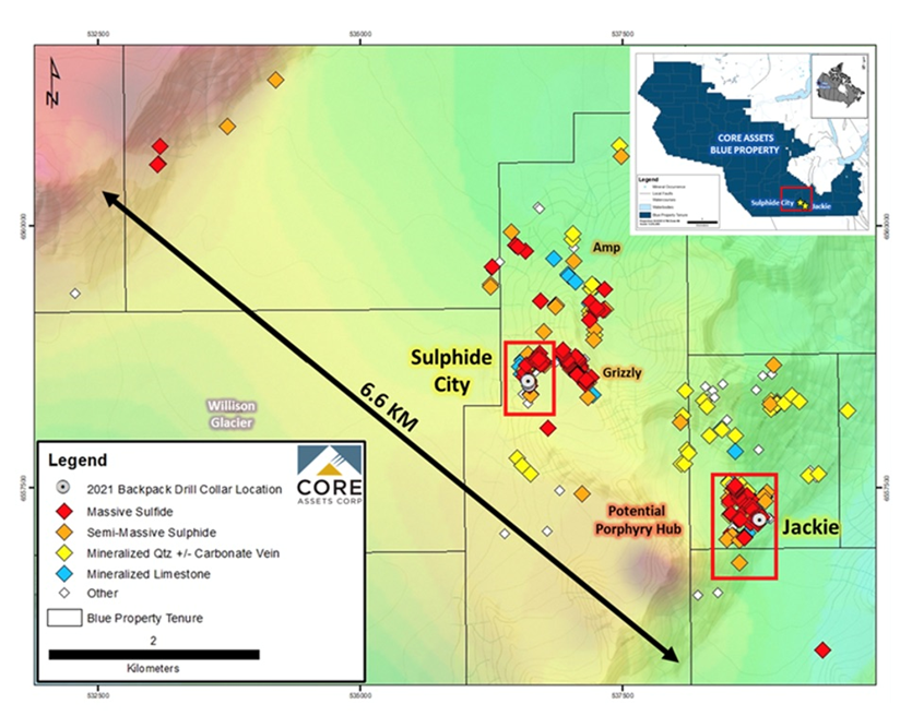 Location of the Sulphide City and Jackie targets, within the extensive 6.6 km mineralized corridor at the Blue property, are shown on the map below. All historical and recent surface samples, as well as the locations of the 2021 backpack drill collars, are plotted.