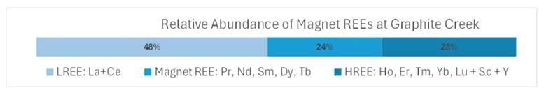 Initial test work identified all five of the principal permanent magnet REEs at Graphite Creek: neodymium, praseodymium, dysprosium, terbium and samarium.