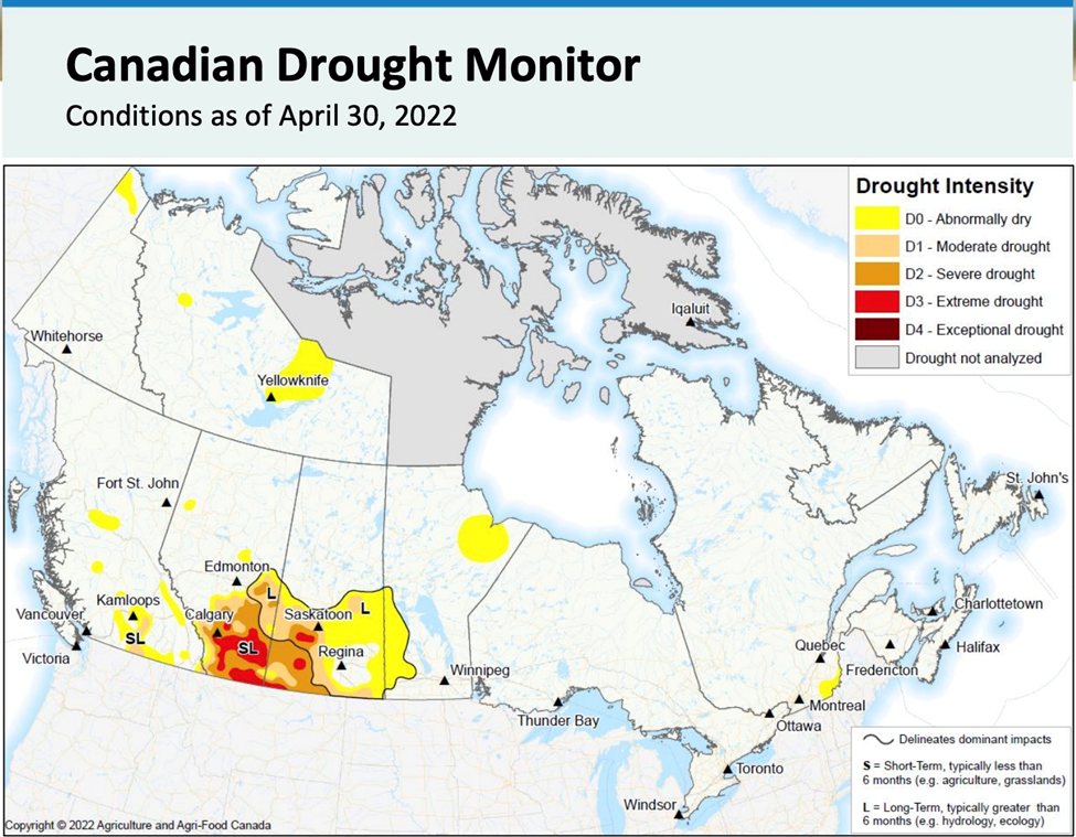 A second map shows much of the Canadian Prairies in drought, as of April 30, with the driest areas (Severe drought in brown and Extreme drought in red) straddling most of southern Alberta, Saskatchewan and Manitoba. Abnormally dry areas depicted in yellow extend into British Columbia, northern Manitoba and the area around Yellowknife, NWT.