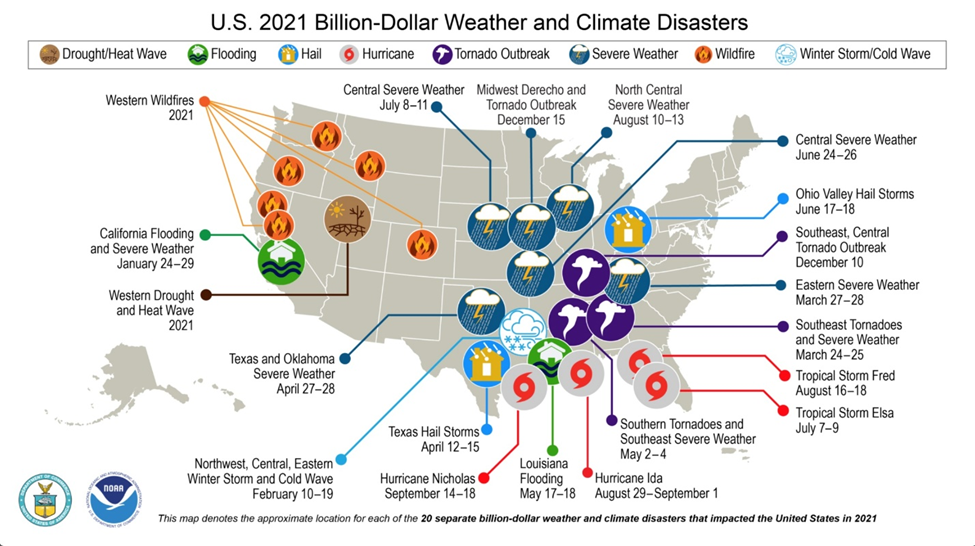 According to the National Oceanic and Atmospheric Administration (NOAA), between hurricanes, wildfires and floods, 2021 was the third-costliest disaster year ever, with an estimated $145 billion in total economic losses, behind only 2017’s $346 billion and 2005’s $244 billion. Over 680 lives were lost in these extreme weather events.
