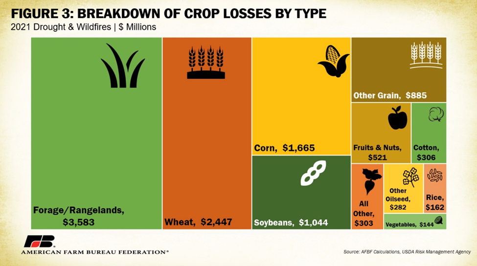 Total crop and rangeland losses were pegged at over $12.5 billion, of which drought and wildfires alone accounted for over $3.3B in losses that were not covered by Risk Management Agency (RMA) programs. Crop loss estimates from the American Farm Bureau Federation (AFBF) do not include infrastructure damage, livestock losses, or losses to horticulture and timber.