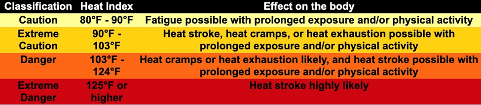 People are generally comfortable living and working in temperatures up to about 80 degrees Fahrenheit. The heat index is what the temperature feels like when relative humidity is combined with relative humidity. Between 80 and 90 degrees F, fatigue is possible with prolonged exposure and/or physical activity. From 90 to 103, heat stroke, heat cramps or heat exhaustion are possible. The danger zone is entered @ temperatures between 103 and 124, with extreme danger happening when it gets to 125 F (51 Celsius) or higher.