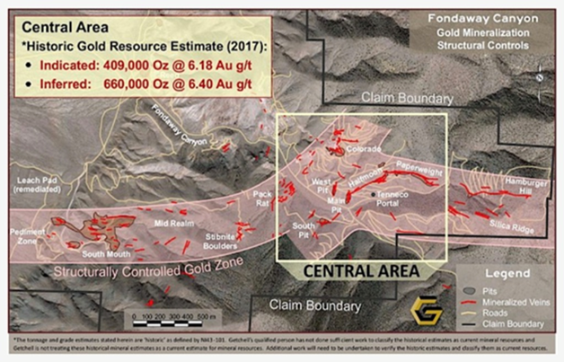 The latest technical report on Fondaway Canyon (2017) gave an estimate of 409,000 oz indicated gold resources grading 6.18 g/t Au and 660,000 oz inferred grading 6.4 g/t Au — for a combined 1.1 million oz.