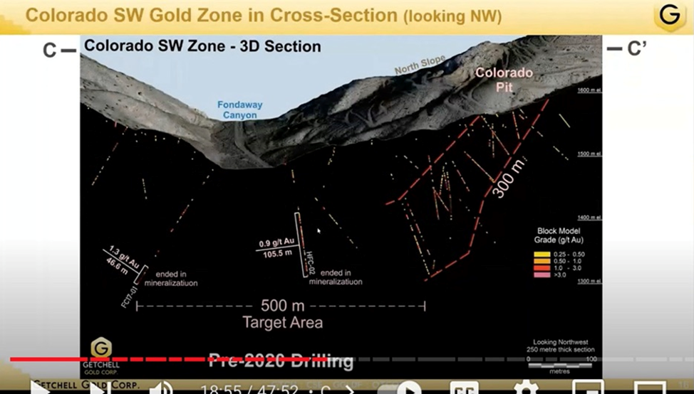 Below is what the Colorado SW section looked like when Getchell acquired the project in 2020. The majority of drilling is seen under the words “Colorado Pit”. It runs for a 300-meter extent.